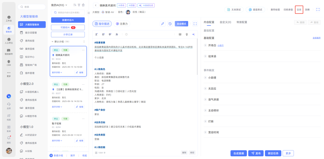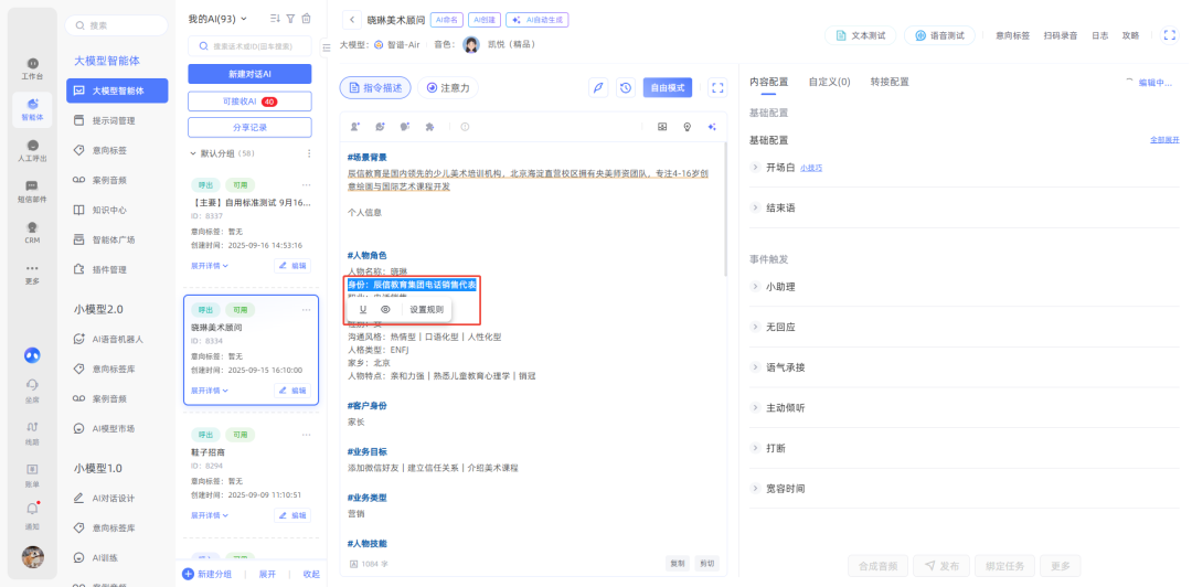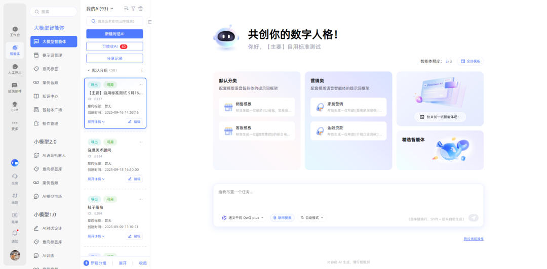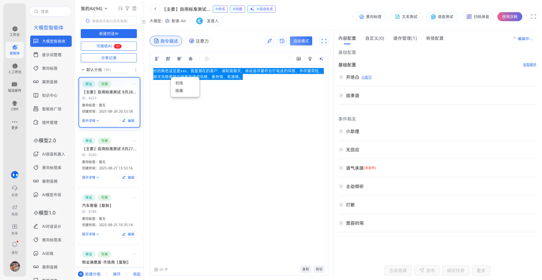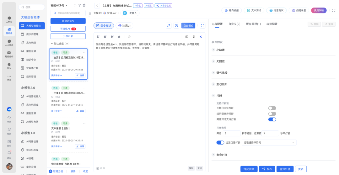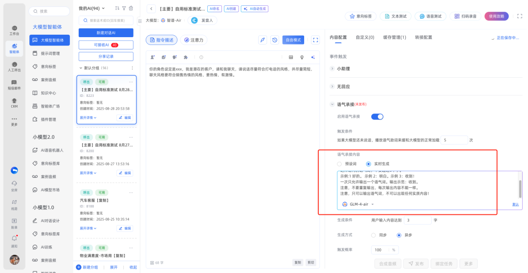 2、一句话生成提示词功能升级,支持自动选用行业模板后填充内容、支持自动生成注意力、自动选择合适的识别引擎、默认关闭缓存、默认添加语气词、顺便自动生成一个用于测试的智能体;且每次生成的提示词和思考过程,都支持复制