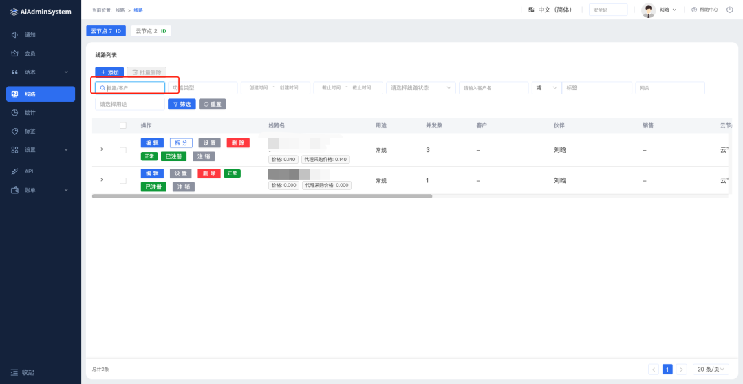代理端的线路支持搜索线路名和客户名称(模糊搜索)进行匹配
