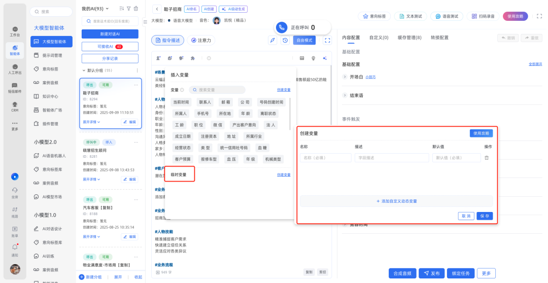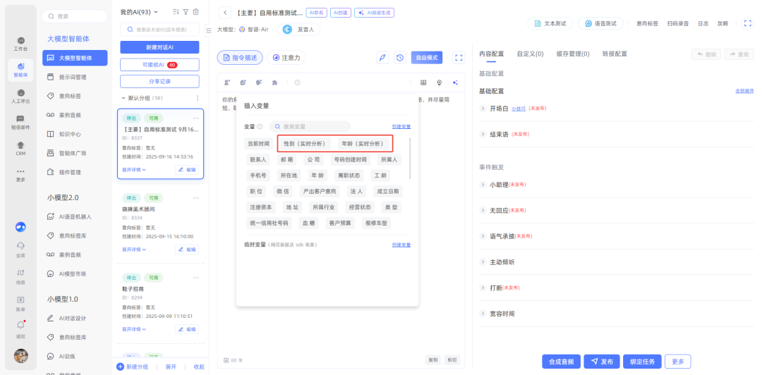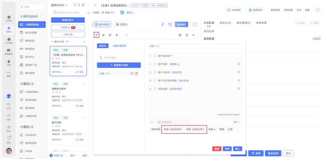 1、大模型智能体在提示词中可插入性别、年龄变量,根据对方的声音来判断性别和年龄(注意需要客户说话才能判断)