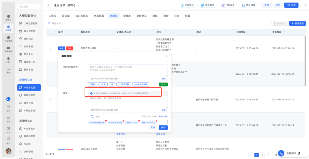 7.话术2.0在新增问法的时候将会给出提示:单个问法字数在 4-30 字符以内,字数过少或过多会导致识别混乱