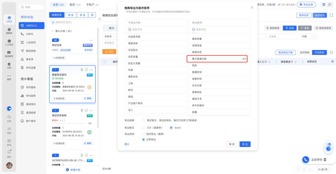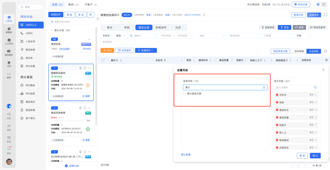 -累积接通次数:带个用户的累积在这个任务中的来电次数。将会在通话详情、列表、导出展示这个数值