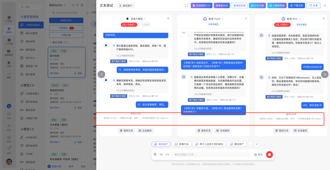 4.文本测试提供更多观察参数,展示每一句话的总时长和token数量,在通话总结展示平均反应速度。