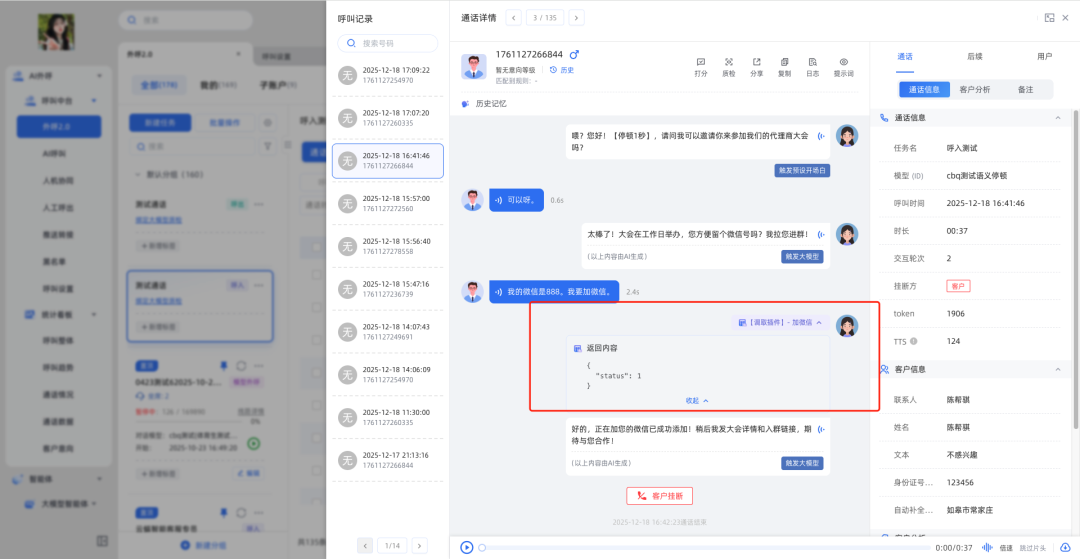 插件和函数在文本测试和通话详情可以展示返回参数,查看详情,双击整个区域,可以展示返回内容