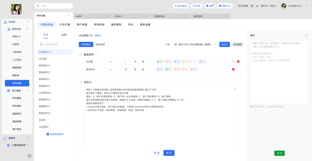 大模型质检模式切换的时候,在同一质检规则下,将会保留客户书写的内容