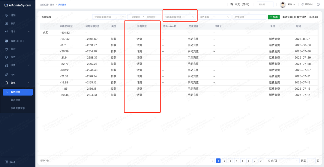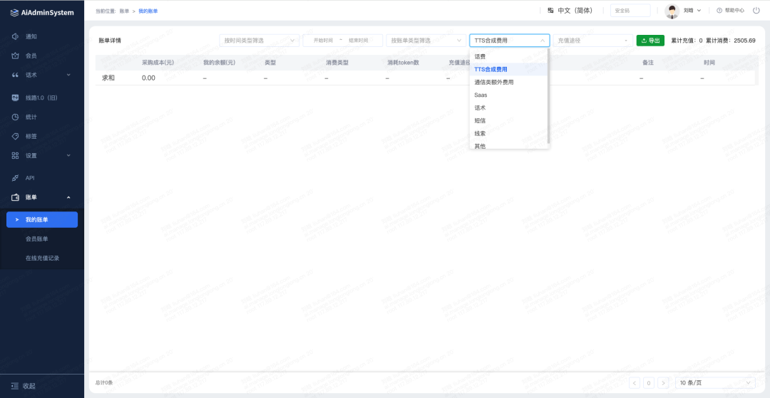 2.代理的账单里面可以具体细分为消费类型:通信类额外费用、SaaS、话术、短信、线索、其他。且账单支持按照时间类型和账单类型筛选查看。