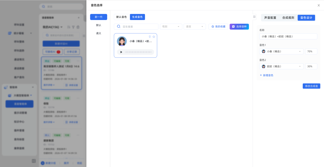 3.新生成的混合音色根据配置的权重比例给出音频条,且合成音色的卡片支持删除与编辑