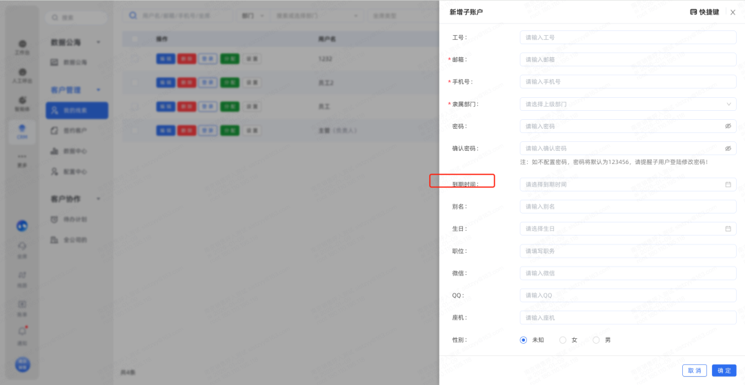 3.子账户新增到期时间设置页面(到期时间小于终端账户到期时间),支持列表查看和排序,到期后不支持登陆但是保留账户内数据。