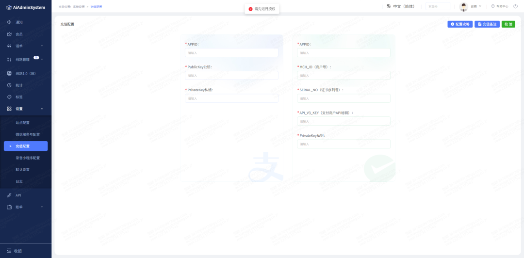 2、代理端未授权禁止保存充值配置信息或支付配置信息