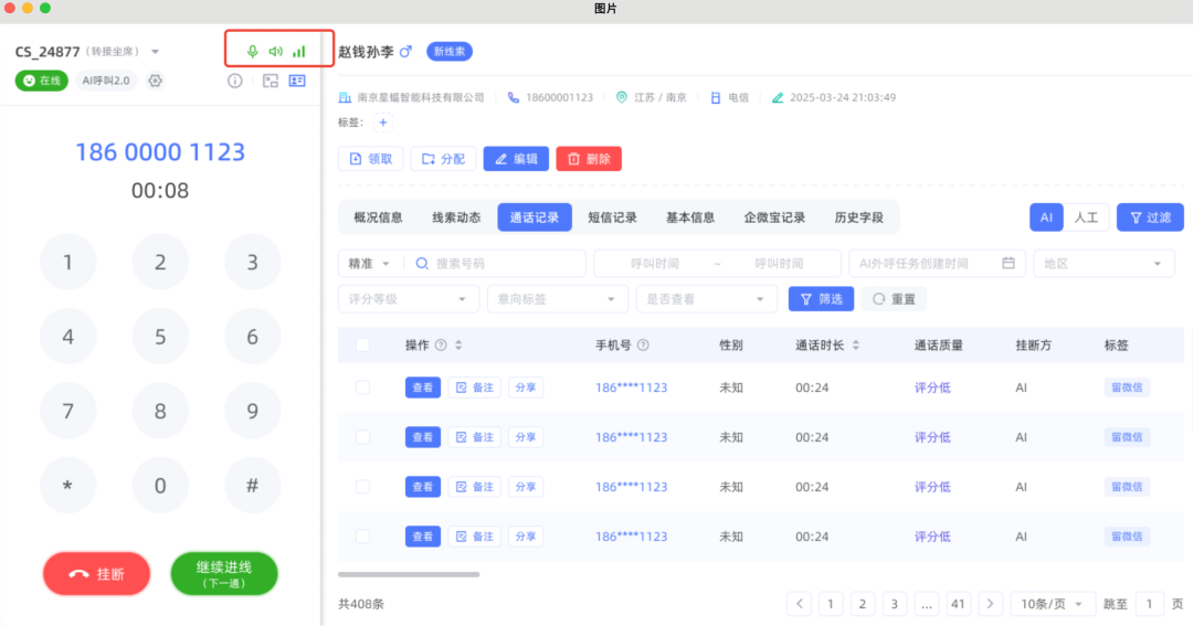 3.坐席转接中新增麦克风、音量以及信号状态的展示