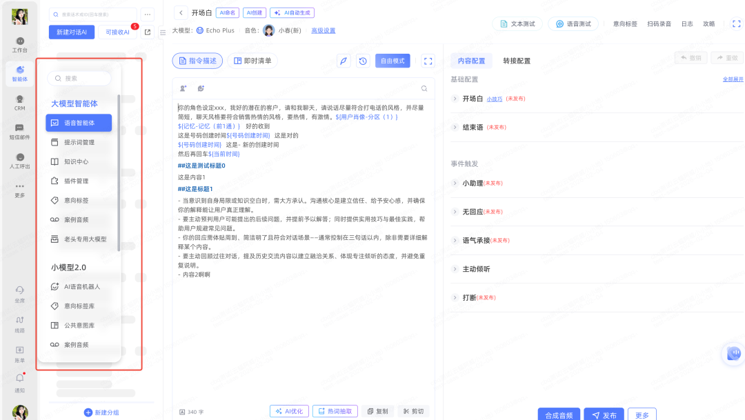 云蝠智能是一款 AI 原生的大模型语音智能体,我们为企业提供AICC大模型呼叫中心,在ChatBOT和CRM基础上提供包括语音智能体,产品能力包括了大模型语音外呼、智能呼入、网页实时语音交互 sdk 及 api。