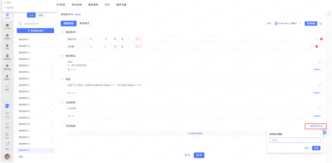 4、支持根据智能体模板内容自动生成大模型质检提示词以及抽取字段